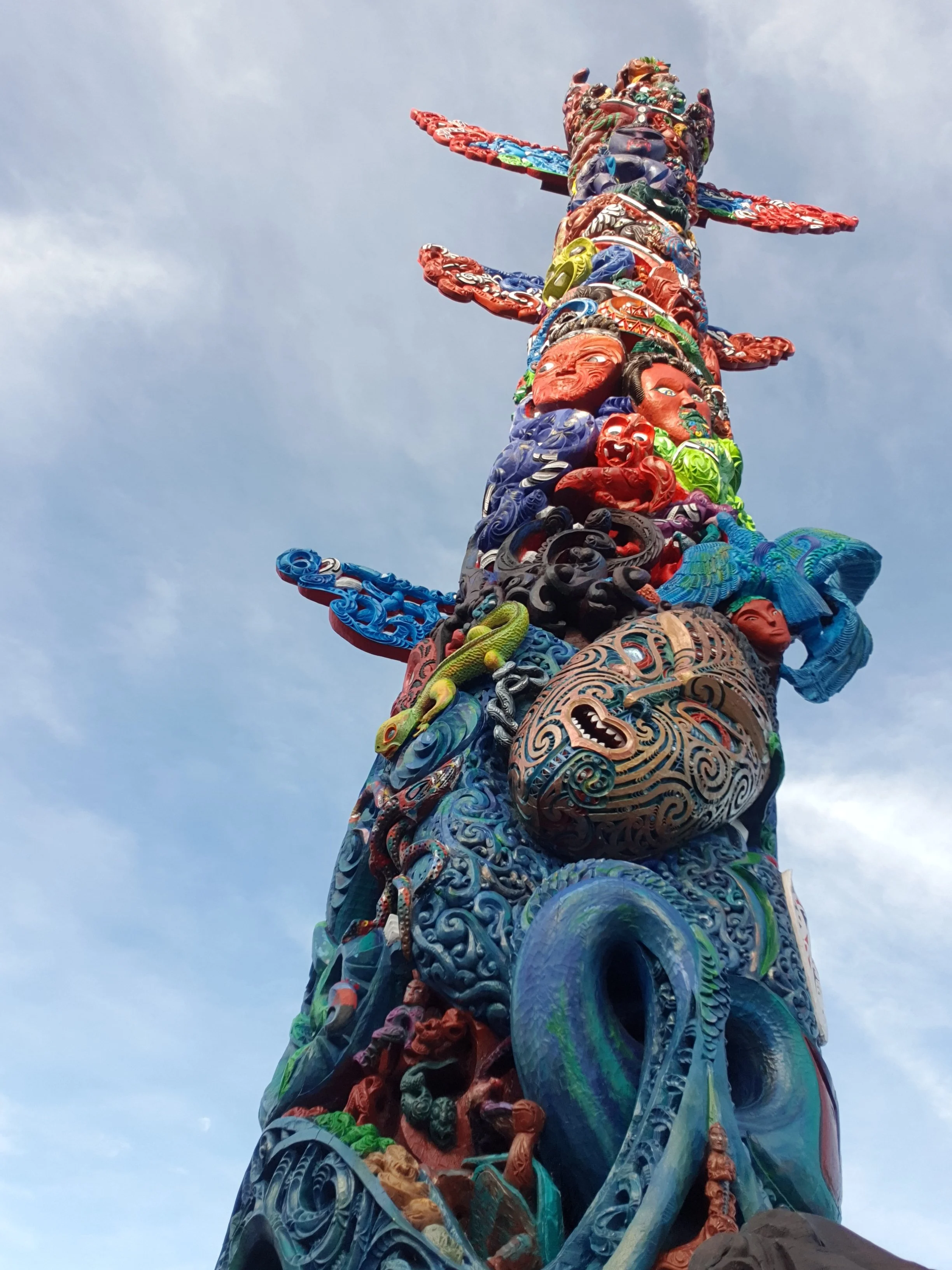 Pou Kapua is recognised as the largest Māori / Pacific Pou / totem in the world, reaching over 80 feet in height and weighing more than 20 tonnes. Pou Kapua is carved from 2,000 year-old magnificent ancient Kauri from the forests of the northern iwi / tribes; 50,000 year-old swamp kauri; 1,000 year old totara; is supported with carved steel; and adorned with paua, pounamu, bone and crystal.